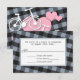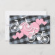 Cartes de réponse RSVP de mariage personnalisées avec un design alternatif comprenant 2 bicyclettes blanches sur les coeurs roses, et placées sur un motif gris et noir incliné en vichy.