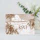 Un modèle de carte de réponse à l'eau-forte de plage tropicale modifiable avec des lettres scriptes et serif sur une gravure vintage de palmiers bruns sur une plage de sable et de beaux nuages sur des vagues océaniques calmes, et un espace pour votre réponse et les dates au verso.
