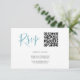 Simplifiez l'organisation de votre mariage avec nos cartes de réponse élégamment conçues, dotées d'un code QR pratique qui dirige les invités vers votre site web de mariage pour des réponses faciles. Ces cartes sophistiquées ne sont pas seulement pratiques ; elles constituent un élément stylé de votre papeterie de mariage, avec une couleur bleu turquoise vibrante au verso qui ajoute une touche rafraîchissante de couleur et complète n'importe quel thème de mariage, en particulier ceux avec des éléments audacieux ou côtiers.