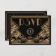 Une carte de réponse RSVP de mariage élégante et audacieuse, de style vintage avec un thème "Gatsby le Magnifique" des années folles dans des tons noirs et dorés. Un fond noir met en valeur la bordure géométrique complexe de style Art Déco dans des tons beige doré. Des polices décoratives de style d'époque ont été sélectionnées pour compléter l'aspect.