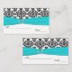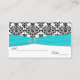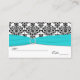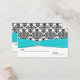 Cette carte Place damassé noir et blanc a un ruban imprimé bleu aqua et un broche à bijoux en diamant IMPRIMÉ qui serait parfait pour un mariage à thème aqua et noir.**REMARQUE, si vous changez la taille de la carte, ou si vous changez les polices, ou la taille de la police, une partie du design et/ou du texte peut être coupé. Tout va s'imprimer comme vous le voyez sur votre écran. Je ne verrai pas les changements que vous faites, et Zazzle ne corrigera rien (fautes de frappe, mauvais alignement, etc.). Le texte est entièrement personnalisable. Si vous avez besoin d'aide pour ce produit, envoyez-moi un courriel AVANT de passer votre commande. Si vous avez besoin d'autres articles correspondants, veuillez envoyer votre demande par courriel à niteowlstudio@gmail.com