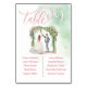 Célébrez votre jour spécial avec ce charmant numéro de table de mariage rustique, mettant en vedette une belle illustration aquarelle d'une mariée et d'un marié sous une arche florale. Le fond lavé d'aquarelle rose et vert évoque une atmosphère romantique et fantaisiste, parfaite pour toute réception de mariage. Cette carte de numéro de table affiche clairement "Table 9" en calligraphie élégante, permettant aux invités de trouver facilement leur place. Sous l'illustration, un espace est prévu pour les noms des invités, ce qui en fait un élément fonctionnel et décoratif pour votre décoration de mariage. Ajoutez une touche de beauté naturelle et de charme personnalisé à votre réception avec cette carte de table unique.