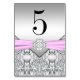 Jolie dentelle en argent avec arc en diamant rose imprimé. Ajoutez vos détails dans le style et la couleur de police, et le libellé de votre choix à l'avant et à l'arrière de cette élégante carte de table rose.