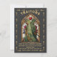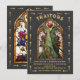 Cartes d'invitation pour une soirée mystère "TRAÎTRES" inspirée des cartes de tarot. Représente un homme et une femme en vitrail, vêtus de capes et armés, dans un cadre de fenêtre d'église avec un fond noir texturé faux. Détails dorés faux. Parfait pour Halloween, une soirée sous les étoiles, un thème cosmique, horoscope, gothique ou une nuit magique et mystérieuse de meurtre. Tout le texte peut être modifié. Doré faux. Pour apporter d'autres modifications, allez sur Personnaliser ce modèle. En bas, vous verrez "Voulez-vous personnaliser encore plus ce design ? Cliquez sur le bouton MODIFIER en utilisant l'outil de conception. À partir de là, vous pouvez changer certaines polices et certaines couleurs, déplacer des éléments ou supprimer ce dont vous avez besoin.