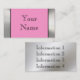 Une frontière métallique de cadre de regard en chrome argenté lisse de regard d'acier inoxydable sur l'avant de la carte avec un arrière - plan rose-clair donne un carte de visite de professionnel-regard du sembler audacieux 3d et unique. Facilement personnaliser avec votre propre information. Employez la police élégante noire dynamique montrée ou changez facilement le style de police et le colorez. Également vous pouvez facilement changer l'arrière - plan rose de couleur en n'importe quelle couleur. Cliquez sur juste dessus la "personnaliser il" et cliquez sur alors dessus "éditent" et alors "arrière - plan" pour le changer. Une carte de regard unique et futée, particulièrement grande pour industriel, des concepteurs, des artistes, la vente au détail, etc. Plus d'information peut être aussi bien mise sur le dos sur l'arrière - plan lisse de regard en métal. La conception est imprimée sur le papier, métal non réel. Un carte de visite fort qui se tient du repos.