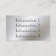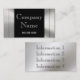 Une frontière métallique de cadre en chrome argenté lisse de regard d'acier inoxydable sur l'avant de la carte avec un arrière - plan noir dynamique donne un carte de visite de professionnel-regard du sembler audacieux 3d et unique. Facilement personnaliser avec votre propre information. Employez la police élégante assortie de gris argenté montrée ou changez facilement le style de police et le colorez. En outre, vous pouvez facilement changer l'arrière - plan noir de couleur en n'importe quelle couleur. Cliquez sur juste dessus la "personnaliser il". Une carte de regard unique, particulièrement grande pour des échanges industriels et qualifiés des professions de construction et de construction. Plus d'information peut être aussi bien mise sur le dos sur l'arrière - plan lisse en métal. Un carte de visite fort qui se tient du repos. Métal normalement imprimé et non vrai.