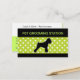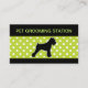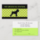 Cartes de visite de marionnettistes avec un beau motif pois vert et blanc stylisé sur un arrière - plan noir, avec l'image d'un chien sur le devant et deux parties du texte vous pouvez customiser et personnaliser qui comprend un modèle de rendez-vous. Remettez vos cartes de visite avec style, ce modèle est conçu pour un toiletteur, un toilettage mobile ou une boutique pour animaux de compagnie.