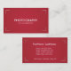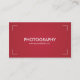 Ces cartes de visite lisses ont été faits avec des photographes et des studios de photographie à l'esprit. Ils comportent les cadres faisants le coin de photo sur un arrière - plan texturisé rouge. L'avant contient la pièce pour que vous ajoutiez votre nom de la société (ou le laisser comme PHOTOGRAPHIE) et votre site Web de société. Le dos a la pièce pour votre nom et tous autres détails d'affaires.