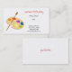 Cartes de visite appropriés à tout artiste ou professeur d'art. Cette carte comporte un arrière - plan blanc avec un dessin d'un pinceau de palette de peinture et de l'aile gauche. Tout le texte est personnalisable sur l'avant et le dos et vous pouvez ajouter plus si nécessaires.