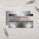Un motif métallique de diamant et un plat lisse pour votre nom ou raison sociale en rouge montré, ou n'importe quels couleur, adresse et numéro de téléphone en chrome argenté de regard d'acier inoxydable sur l'avant de la carte donne un carte de visite audacieux et unique de cool du regard 3d. Facilement personnaliser avec votre propre information. Employez la police audacieuse noire montrée ou changez facilement le style de police et le colorez. Une carte de regard unique, particulièrement grande pour des échanges industriels et qualifiés des professions de construction et de construction, des affaires des véhicules à moteur, etc. Plus d'information peut être aussi bien mise sur le dos sur l'arrière - plan de regard métallique d'argent lisse de brosse. Imprimé sur le papier, métal non réel. Un carte de visite fort qui se tient du repos.