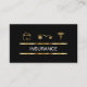 Modèle classique de carte de visite d'assurance incluant l'apparence d'un symbole de maison dorée, symbole de voiture et symbole de santé représentant l'assurance pour la maison, l'automobile et la santé. Conçu pour une compagnie d'assurance, un représentant commercial ou un expert en sinistres.