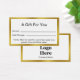Ce modèle de certificat cadeau blanc et faux or dispose d'un texte d'affichage que vous pouvez modifier pour créer un certificat cadeau professionnel personnalisé. Ces cartes blanches ont une fausse bordure en or. (La bordure n'est pas faite de feuille.) Il y a des lignes pour que vous écriviez le montant du certificat et la date à laquelle il est valide. L'autre côté a une image d'affichage que vous pouvez remplacer par votre logo et afficher le texte pour le nom de votre entreprise.