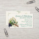 Modèle de carte de visite pour le tisanier ou le propriétaire d'une épicerie apothicaire. Couleur blanc cassé avec texte bleu-vert turquoise pour customiser à trois endroits sur l'avant. Inclure le nom dans le script, "herboriste" ou tout autre texte imprimé en dessous et plus d'informations dans le paragraphe ci-dessous. Tout le texte s'aligne à droite. Le design est composé de fleurs blanches de fièvres, de racines de réglisse et d'airelles violettes foncées. L'image d'herbe est sur le côté gauche. Le dos de la carte est blanc-pâle avec un motif arrière - plan de fils et de fleurs de fièvres.