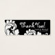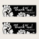 White & black mariage damassé faveur tag cadeau, avec les mots "Merci" dans une police de caractères fantaisie. Les noms des mariées et des mariées et la date du mariage sont imprimés sous le message.Un arrière - plan damassé aux accents blanc et noir est imprimé derrière le libellé. vous pouvez ajouter votre propre message de remerciement ou d'autres formulations. papier alternatif et couleurs disponibles. Vous devrez percer un trou dans un coin de la carte avec un poinçon en papier, filtrer un ruban et cravate à votre ballotin.