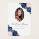 Belle carte de mémoire florale bleu et rose/carte de prière funéraire avec une photo ornée de roses rose et bleu aquarelle et de fleurs d'haleine de bébé sur un arrière - plan blanc clair.