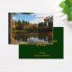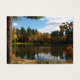 Cette jolie carte de commerce d'artiste présente une jeune femme assise et rêvant sur le quai au bord d'un grand étang. L'automne est dans l'air. L'eau est entourée d'arbres aux magnifiques couleurs feuillues d'automne, jaune, vert, rouge, orange et or. Le ciel bleu est couvert de nuages blancs et tout cela se reflète dans l'eau. Le tronc d'un grand pin définit le côté gauche. Le brillant soleil se reflète dans ses cheveux rouges.