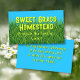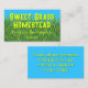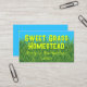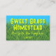 Cartes de visite avec de l'herbe verte et un ciel bleu et un texte gras. Gardez les choses simples avec le nom de la ferme ou de l'entreprise dans une police imprimée amusante. Utilisez une ou deux lignes. Sous le nom, ajoutez une ou deux lignes supplémentaires, avec le lieu et les coordonnées ou autre. Au verso, utilisez le modèle pour ajouter plus d'informations si nécessaire. Supprimez tout le texte pour laisser le verso vide. Les couleurs sont le bleu aqua, le vert herbe et le chartreuse.
