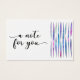 Dans cette conception, la "technologie carte de visite" est utilisée pour créer des cartes de notes pratiques et minuscules pour laisser des messages doux à des proches comme à des étrangers. Les dossiers ont été laissés volontairement vides pour que vous écriviez un message personnel chaque fois que vous le souhaitez. Vous pouvez certainement utiliser la conception de base pour créer un carte de visite réel, si désiré. Sinon, n'hésitez pas à contacter si vous voulez que je crée une mise en page pour vous, qui présente les éléments de conception dans ces cartes de notes de wee. /// À gauche, j'ai utilisé une des polices de script modernes de ma collection - en noir - pour créer un graphique basé sur les mots "une note pour vous". Redimensionnez et repositionnez si vous le souhaitez en cliquant sur le bouton "personnaliser". A droite, des vedettes artistiques abstraites qui créent une atmosphère festive. Les surfaces de ces feutres ont été embellies de textures roses, bleues, turquoises, violettes et rouges.
