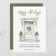 Image d'une porte d'entrée décorée de verdure de fête avec un texte "Joyeuses Fêtes" en écriture moderne aquarelle.
