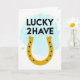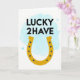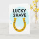 Cette carte présente un fer à cheval doré centré sur un fond blanc, sa teinte jaune chaud donnant à la scène une lueur amicale et accueillante 💚. Au-dessus, les mots « LUCKY 2HAVE » sont empilés en lettres majuscules noires, s'asseyant proprement au-dessus du fer à cheval comme un titre confiant. Un lavis bleu céruléen doux flotte derrière le texte supérieur et la courbe supérieure du fer à cheval, comme un léger nuage dérivant à travers un ciel calme. De petits points bleu foncé courent le long du fer à cheval comme des marques de rivets soignées, ajoutant un détail ancré qui équilibre l'or ensoleillé. Des cercles bleus plus pâles et translucides se dispersent autour du lavis bleu, comme des bulles qui montent et dérivent, ce qui donne à l'espace une sensation aérée et intime. La mise en page simple laisse beaucoup d'espace blanc, laissant le fer à cheval et le message se sentir comme s'ils étaient destinés