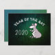 Illustration mignonne d'un rat dans le style de la bande dessinée avec 2020 et "Année du Rat" à personnaliser si vous le souhaitez sur une image métallique verte en arrière-plan. Conception sur carte postale horizontale. Carte de vœux assortie, produits artisanaux et plus...