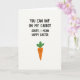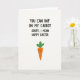 Cette carte présente un fond blanc brillant avec un message de vœux sur plusieurs lignes de style blague placé en haut dans une police sans empattement épaisse et décontractée, avec des lettres sombres pour un contraste fort. La première ligne ressemble à une mise en place aguicheuse, puis se transforme rapidement en vœux saisonniers de Pâques, donnant à la mise en page un clin d'œil amical. Sous le texte se trouve un seul personnage de légume racine de dessin animé, centré et légèrement plus grand que les lettres ci-dessus, comme s'il écoutait la blague 🐰. Le légume est une forme de cône orange chaud surmontée de trois feuilles vertes simples, et son petit visage est fait de deux yeux à points noirs et d'un sourire incurvé. Des marques de rougissement rose doux sur ses joues ajoutent un air timide et affectueux, comme s'il partageait un rire privé avec le lecteur 🌷. Le grand espace blanc vide qui l'entoure garde tout aéré, l'orange et le vert se détachant clairement sur le fond. Le message reste en haut tandis que le personnage ancre la