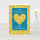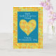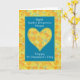 Une jolie carte de vœux pour la fête de la Sainte-Dwynwen avec un cœur et une bordure de jonquilles dorées et 'Joyeuse fête de la Sainte-Dwynwen' en gallois et en anglais ; d'après un modèle aquarellé de Judy Adamson.