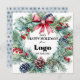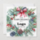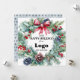 Cartes "Joyeuses Fêtes" personnalisées pour clients ou employés, personnalisées avec votre logo d'entreprise, l'année, une grande couronne florale festive, un grand nœud rouge élégant et un motif de flocon de neige bleu au verso. Fournitures promotionnelles d'entreprise pour Noël.