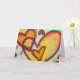 Des cœurs de couleur pêche et orange se connectent comme des bulles qui dérivent ensemble. Un contour vert trace chaque cœur. Des points de couleur jaune pâle sont comme des confettis entre les cœurs. La peinture à l'aquarelle a une légère couche d'or et de rose sur le dessus. Personnalisez cette carte avec votre propre texte et vos propres images en utilisant l'option de personnalisation. Détail du tableau « Laugh » (rire) inspirant.