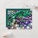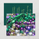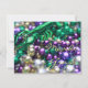 Photographie de colliers de Carnaval colorés. Les couleurs de Mardi Gras (or, vert, violet) sont mises en valeur par un gros collier vert en forme d'écrevisse encadrant la photo. Le recto de la carte d'invitation indique "Mardi Gras". Le verso de la carte d'invitation comporte la mention "Laissez les bon temps rouler !" comme salutation et un espace pour ajouter vos détails personnalisés d'invitation à une fête de Carnaval sur mesure. Tous les mots sur la carte peuvent être personnalisés, selon les besoins.