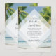 Ce design présente des palmiers tropicaux sur une plage. La belle verdure des palmiers contraste avec le ciel et l'eau bleus. L'élément de diamant blanc opaque met en avant la typographie moderne. Une fusion parfaite de moderne et de chic. Le design de verdure de palmier est idéal pour un mariage à destination de plage tropicale. Design d'invitation de mariage de plage avec des éléments modernes. Les articles de papeterie de mariage assortis et d'autres formats d'invitation de mariage sont également disponibles.