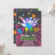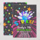 Cartes d'invitation d'anniversaire de quille avec une boule de quille frappant les quilles avec des couleurs vives et des étoiles sur un fond sombre qui dit Strike Lets Bowl For.