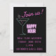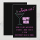 Invitation amusante pour un happy hour avec des collègues / team building etc. Le design présente un verre à martini néon avec un panneau "happy hour" et un texte rose néon personnalisable sur fond noir