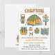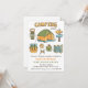 Une invitation de fête d'anniversaire de camping pour inviter les meilleurs amis du garçon ou de la fille d'anniversaire à passer la nuit sous la tente et à partager des moments de convivialité. Le design est accompagné de gribouillages dessinés à la main d'objets essentiels de camping tels qu'une lampe, une tente, des panneaux de signalisation, un sac de camping, une boussole, un couteau multifonction, une bouteille d'eau et une carte ! Le design est numérisé et coloré numériquement avec une palette de couleurs de vert, de bleu et de jaune. Personnalisez facilement avec vos détails de camping dans l'espace prévu.