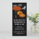 Cartes d'invitation pour fête d'Halloween ou de récolte, convivial pour la famille, avec lettrage effrayant, ciel noir, lune croissante et nuages, famille de citrouilles mignonnes debout sous un arbre avec feuilles d'automne orange. Parfait pour la fête d'Halloween de récolte de l'église.