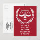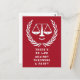 Cartes d'invitation créatives pour la fête d'un avocat pour la célébration de la remise de diplôme de faculté de droit, annonce d'un cabinet d'avocats, annonce de remise de diplôme ou fête d'anniversaire avec des balances de la justice drôles sur fond rouge.