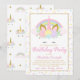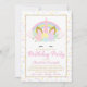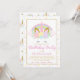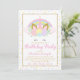 Cartes d'invitation pour une fête d'anniversaire licorne avec une jolie tête de licorne fleurie pastel rose, menthe, lavande et bleu sarcelle et un arc-en-ciel sur un fond joliment multicolore à pois pastel. Ces invitations de fête d'anniversaire mignonnes licorne sont facilement personnalisables pour votre événement en ajoutant simplement vos détails.