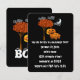 Invitation à Halloween avec un ciel noir, une lune croissante, des nuages et une famille de citrouilles mignonnes debout à côté d'un arbre avec des feuilles d'automne orange et un grand BOO au dos avec des yeux au-dessus des lettres, vous invitant tous à une fête de récolte d'Halloween très mais pas trop effrayante. Parfait pour la fête de récolte d'Halloween de l'église aussi !
