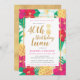 Cartes d'invitation pour un luau d'anniversaire tropical doré avec des fleurs tropicales amusantes et jolies et des ananas, avec des accents dorés. Parfait pour une fête d'anniversaire sur le thème du luau ! Illustré ici pour un quarantième anniversaire, mais vous pouvez modifier pour n'importe quel âge ou occasion !