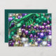 Photographie de colliers de Carnaval colorés. Les couleurs de Mardi Gras (or, vert, violet) sont mises en valeur par un grand collier en forme de homard vert encadrant la photo. Le recto de la carte d'invitation indique "Mardi Gras". Le verso de la carte d'invitation comporte la mention "Laissez les bon temps rouler !" comme salutation et un espace pour ajouter vos informations personnalisées pour l'invitation à votre fête de Carnaval sur mesure. Tous les mots sur la carte peuvent être personnalisés, selon les besoins.