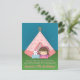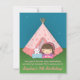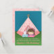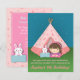 Organisez une soirée pyjama de camping dans votre jardin pour la fille qui fête son anniversaire en commençant par cette adorable invitation pour les invités ! L'invitation présente une tente tipi rose sur une parcelle de gazon. Le tipi comporte des étoiles et des icônes de croissant de lune. Une petite fille vêtue d'un haut violet et d'un bandeau rose dépasse de la tente. Un jouet lapin blanc est à côté d'elle sur un oreiller bleu. Des étincelles d'étoiles brillent dans le ciel en arrière-plan. La palette de couleurs principalement rose convient parfaitement pour les filles d'anniversaire. Personnalisez facilement avec les détails de la fête.