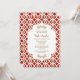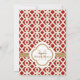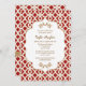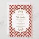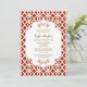 Cartons d'invitation de douche de mariée élégants et beaux inspirés du Maroc français avec un motif géométrique répétitif écarlate rouge rubis et or et des fioritures florales dorées. Cette invitation luxueuse et haut de gamme est parfaite pour toute douche de mariée formelle, exotique, marocaine, sur le thème des Mille et Une Nuits ou d'Aladdin. Le dos de ces invitations et annonces personnalisées et encadrées peut être personnalisé avec le monogramme de la future mariée et le nom de l'événement sur la forme à quatre feuilles et le design à ruban imprimé. Œuvre et conception © Chrissy H. Studios, LLC. Tous droits réservés.