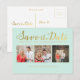 Magnifique typographie en feuille d'or faux sur le devant de cette carte postale de créateur que vous pouvez personnaliser avec 3 portraits de vos propres photos de fiançailles/mariage. Personnalisez facilement et rapidement cette carte postale de remerciement imprimée par un professionnel ici et maintenant, simplement en tapant par-dessus le texte d'exemple et en ajoutant vos propres photographies. Élégante, chic, simple et classique typographie en écriture cursive/or script doré.