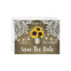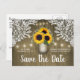 Cartes postales d'annonce de date de mariage à l'affiche de tournesol rustique en pot Mason - comportent un fond unique en bois de grange avec une dentelle élégante et des guirlandes lumineuses. Ce design présente également un pot Mason rempli de tournesols et de baby's breath. Le pot Mason est orné d'initiales que vous pouvez modifier à votre guise.