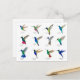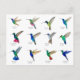 Carte postale unique représentant plusieurs espèces de colibris tropicaux peints à la main, tels que le colibri mango, le colibri coronette pourprée, le colibri à gorge bleue, le saphir à queue dorée, le colibri front étoilé foncé et le colibri oreille-de-violet mexicain, entre autres. Images tirées de mes peintures aquarelles originales.