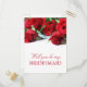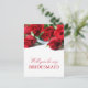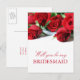 Carte postale demoiselle d'honneur romantique en rouge et blanc avec des roses et des polices élégantes.