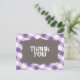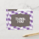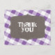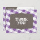 Cartes postales de remerciement rustiques d'inspiration du Sud, conçues avec du "Merci" en blanc sur une illustration de texture de toile de cadre marron, sur un motif en vichy en diagonale violet et blanc. Le côté arrière est personnalisé avec votre propre message de remerciement personnalisé. Vous pouvez aussi facilement supprimer le texte modèle pour laisser la ou les cartes en blanc pour écrire votre propre sentiment de gratitude. Ces cartes, avec leur motif en vichy classique, sont parfaites pour les célébrations de Baby shower et de Fête des mariées du Sud.