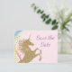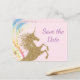 Cartes postales pour sauver la date de la fête d'anniversaire licorne avec une jolie licorne dorée sur un fond en spirale arc-en-ciel. Ces cartes postales de sauvegarde de la fête d'anniversaire licorne sont facilement personnalisables pour votre événement en ajoutant simplement vos détails dans le style de police que vous préférez. Vous pouvez également changer la couleur de fond. Il s'agit d'une conception imprimée sans véritable paillettes.