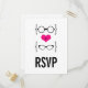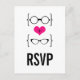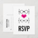 Chic et original Geeky Glass Mariage Response Carte Postale avec un coeur rose vif flanqué de deux paires de lunettes geeky, une paire de manies et une paire de ceintures représentant le marié et la mariée. Cette carte postale RSVP décalée mais sophistiquée est parfaite pour votre mariage nerdy ! Facile à customiser, ajoutez simplement les détails de votre grand jour dans les champs de texte fournis. Cliquez sur le bouton "Customiser" pour trouver d'autres options de personnalisation.