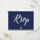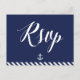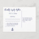Cartes postales RSVP de mariage nautique avec rayures bleu marine et blanc, ancre blanche et texte blanc personnalisé, imprimé sur arrière - plan bleu marine